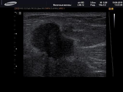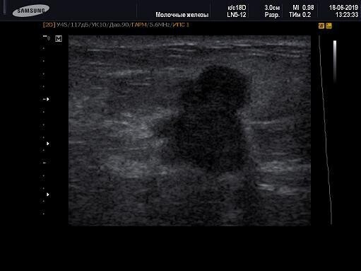 При визуальном осмотре обнаружили гиперемию (покраснение кожных покровов) в месте проекции образования, со слов появилось несколько дней назад. Образование плотное, неподвижное. На мониторе УЗИ-аппарата выявлены образования неправильной формы с неровными контурами, вертикальной ориентацией (это важный критерий в диагностике рака молочной железы), в полости которых визуализируется кальцификат, также присутствовал фиброз и отек прилежащей к опухоли ткани.